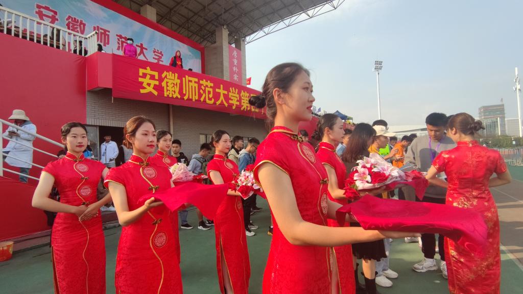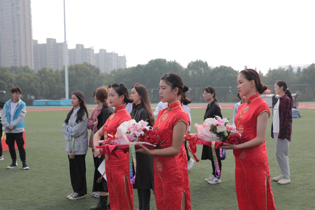 无我、无私、更无畏,这就是师大礼仪队的精神,作为礼仪队成员的她们身着红色旗袍,举止优雅得体,身姿婀娜曼妙。在运动会的每一个荣耀时刻,即便深秋的冷风飒飒,她们都会面带笑容的陪伴着。作为礼仪部的新成员,2020级社会学类的孙皓冉说:“运动会场上会有很多突发状况,比如今天早上的大风,给身穿旗袍手拿捧花的我们造成了一些影响,但大家都会克服困难”。2020级播音主持专业的斯玉说:“虽然等待的时间大家手脚冰冷十分难熬,但每个人都很骄傲能够为颁奖典礼服务”。