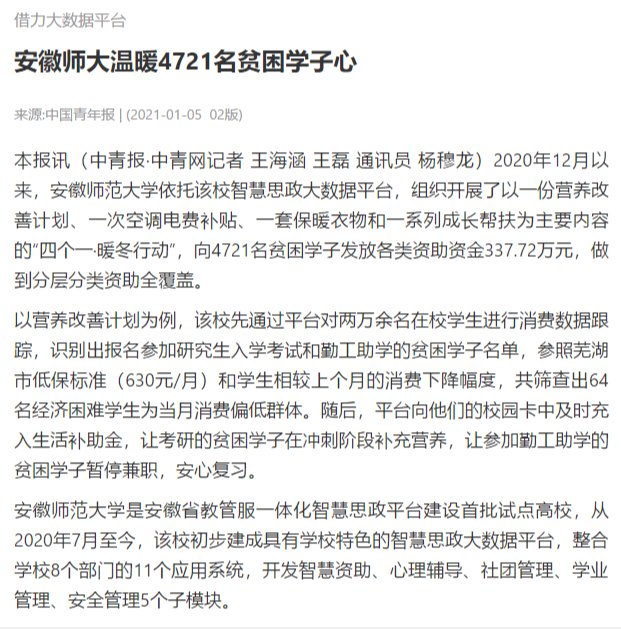 【中国青年报】借力大数据平台 安徽师大温暖4721名贫困学子心