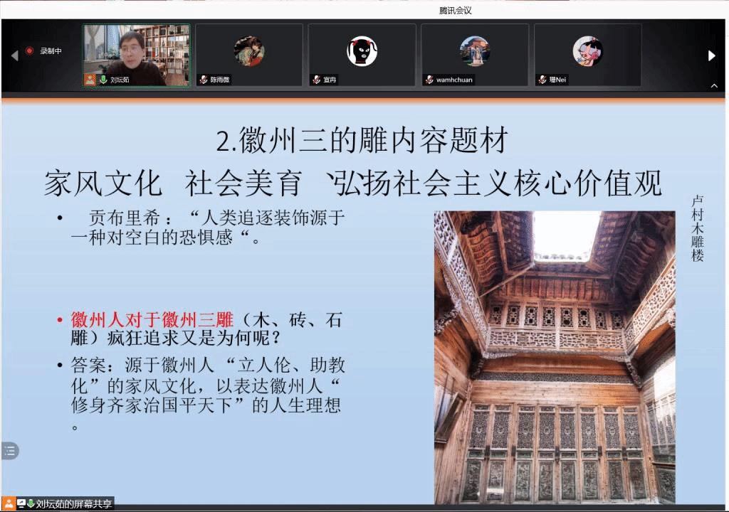 本讯网(教务处  美术学院)为贯彻落实《高等学校课程思政建设指导纲要》,深化教学模式改革,推进专业课与思政课相统一的协同效应,学校举行“教育2035”课程思政系列报告。12月25日下午,“教育2035”课程思政系列报告第27讲在腾讯会议开讲,本期由美术学院刘坛茹副教授带来题为《“徽文化概论”课程思政的文化脉络与美育践行》的专题汇报,美术学院陈琳副院长及师生代表在线参与了此次活动。