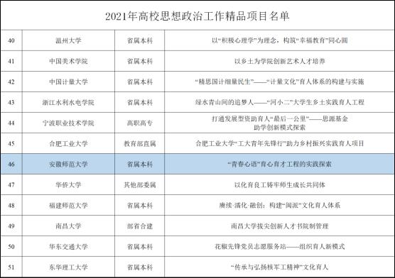 本网讯(学生处 聂余)近日,教育部思想政治工作司公布了2021年高校思想政治工作有关培育建设项目入选名单,经过组织推荐、资格审核、专家遴选、结果公示等程序,我校心理育人项目《“青春心语”育心育才工程的实践探索》成功入选2021年度全国高校思想政治工作精品项目(全国共100项,安徽省仅2项)。