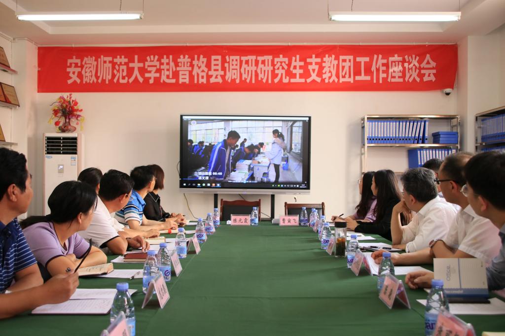 座谈会由郭吕刚主持。日火哈古介绍了凉山州现有的高校研究生支教团规模及现状,表示期待研支团发挥特长,打造一系列品牌化、特色化的志愿服务项目,助力当地教育事业发展。周端明介绍了我校研究生支教团志愿者的选拔、培训以及管理情况,并就与普格县开展多方面合作、助力当地教育事业发展提出意见。陈骁介绍了我校研究生支教团项目的基本情况。龙尔聪在座谈会上介绍了普格中学的建校历史和办学理念,并对我校研究生支教团志愿者扎实的业务能力、务实的工作作风和取得的成绩给予了充分肯定。我校第22届研究生支教团团长王吉慧从前期准备、教育教学、志愿服务、品牌活动四个方面汇报了团队组建以来的工作开展情况。研支团9名志愿者围绕近一年以来的支教工作分享了自己的体会和感受。往届志愿者代表、我校2019级中国语言文学专业硕士研究生宁嘉惠在发言中深情回顾了在当地一年的支教经历,并对服务地领导老师们的关心和帮助表示感谢。与会人员还共同观看了安徽师范大学第22届研究生支教团微视频《支教十二时辰》。