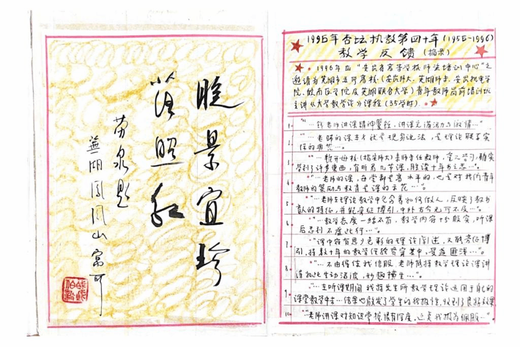 他的学生说:“老师理论教学中包含着做人之道,反映了教书育人的特征,能旁征博引,古今中外无所不及。”