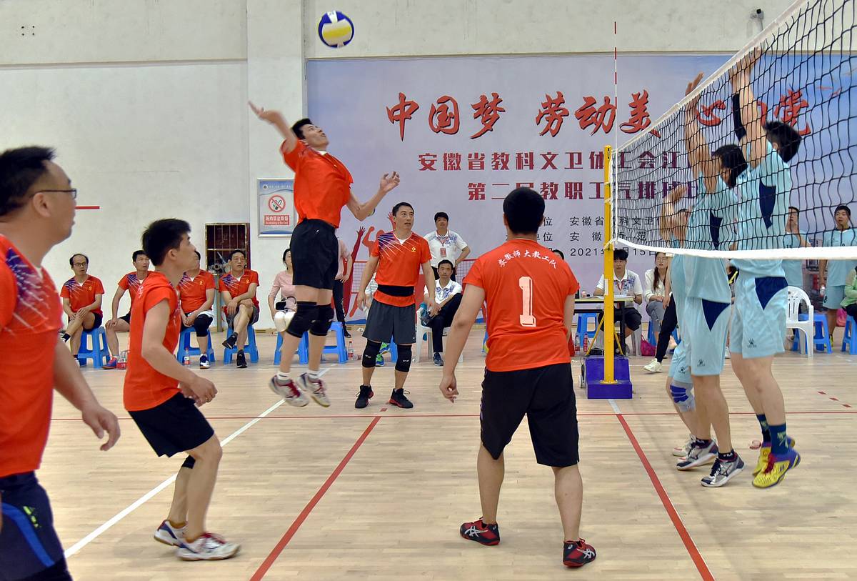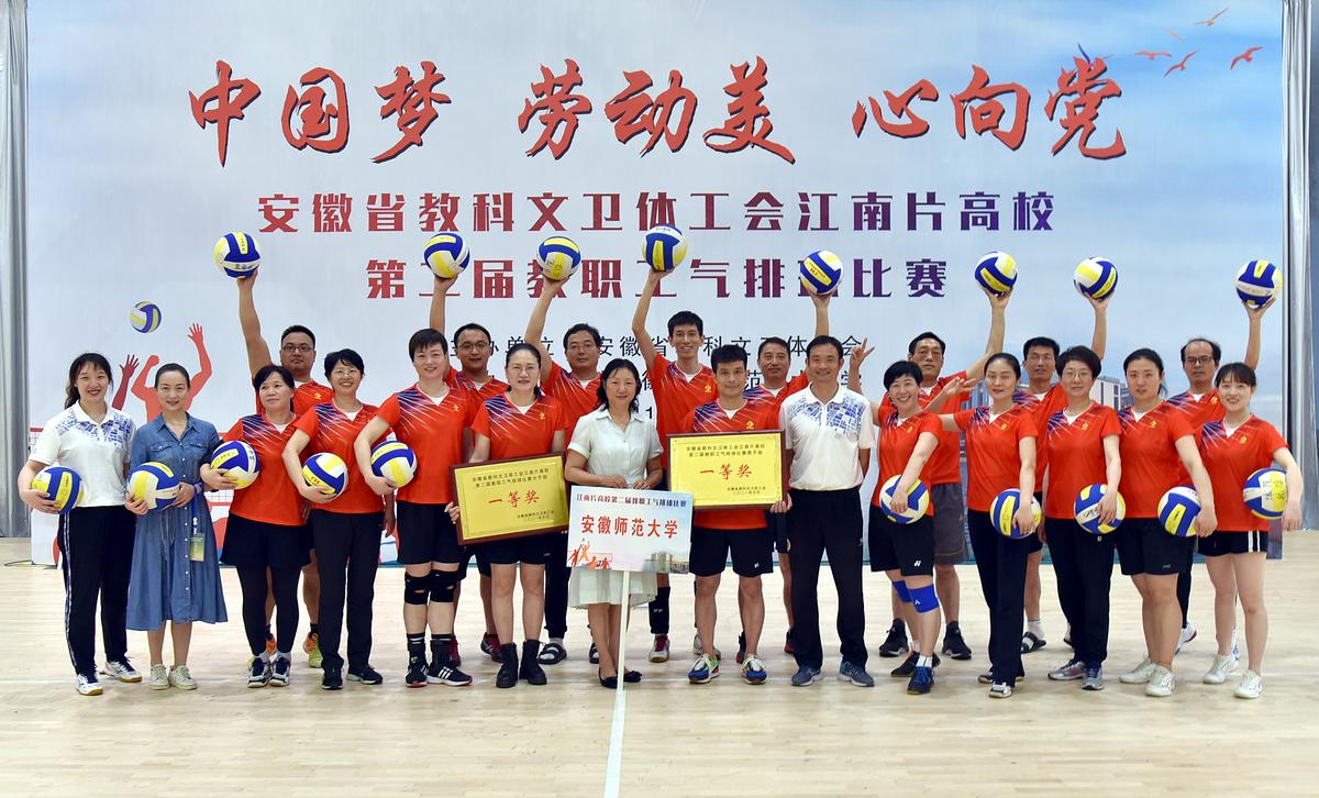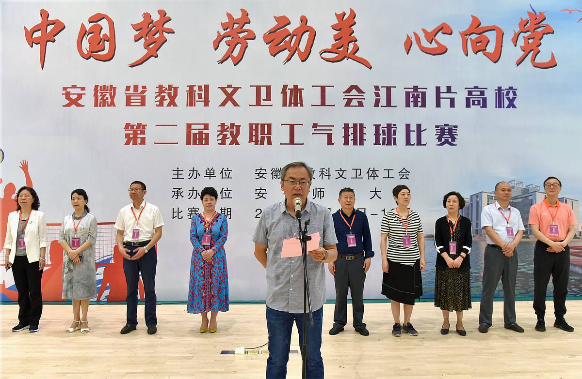 本网讯(校工会李平/文 吴佑平/图)5月15日至16日,安徽省教科文卫体工会江南片高校第二届教职工气排球比赛在我校花津校区北侧体育馆顺利举行。比赛由省教科文卫体工会主办,安徽师范大学承办,江南片高校19支代表队近200名运动员参加了比赛,校党委副书记蒋家平、江南片各高校工会负责人、领队等参加了开幕式,校工会主席、江南片高校工会片长单位负责人余大芹主持仪式。