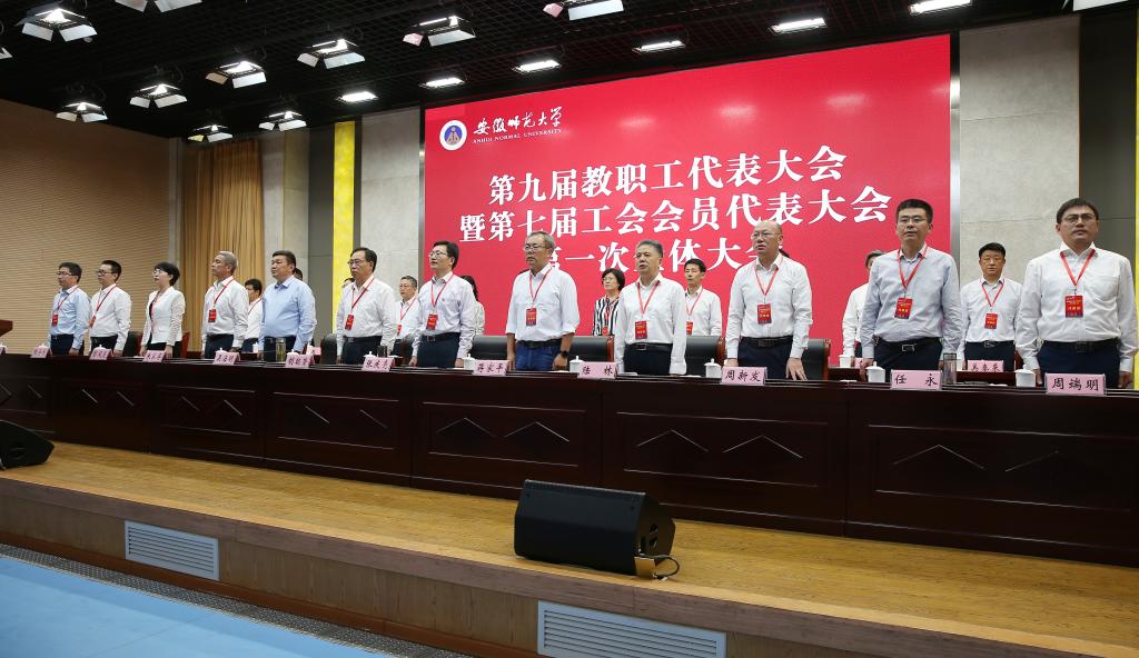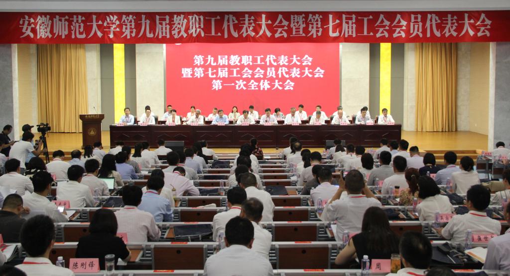 本网讯(党委宣传部 王哲谦)6月7日,安徽师范大学第九届教代会暨第七届工代会在花津校区实习实训报告厅隆重召开。200多名代表肩负着全校教职工的期待和重托,汇聚一堂,共商学校发展大计。省教科文卫体工会主席吴海明,学校部分老领导、历届工会主席,部分单位主要负责同志和全体代表参加会议。