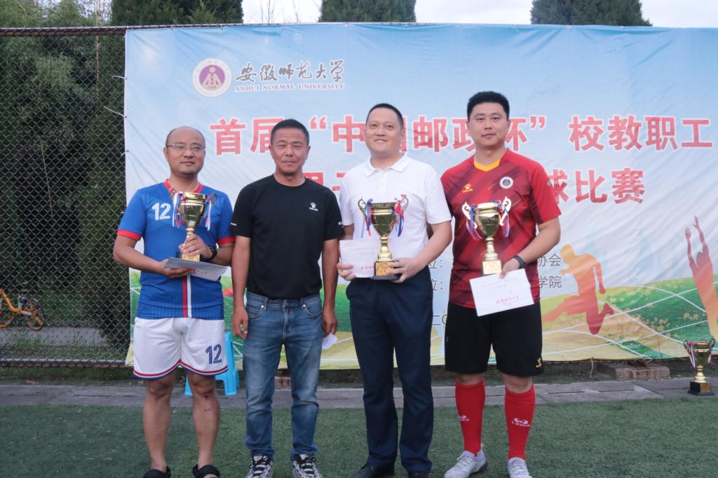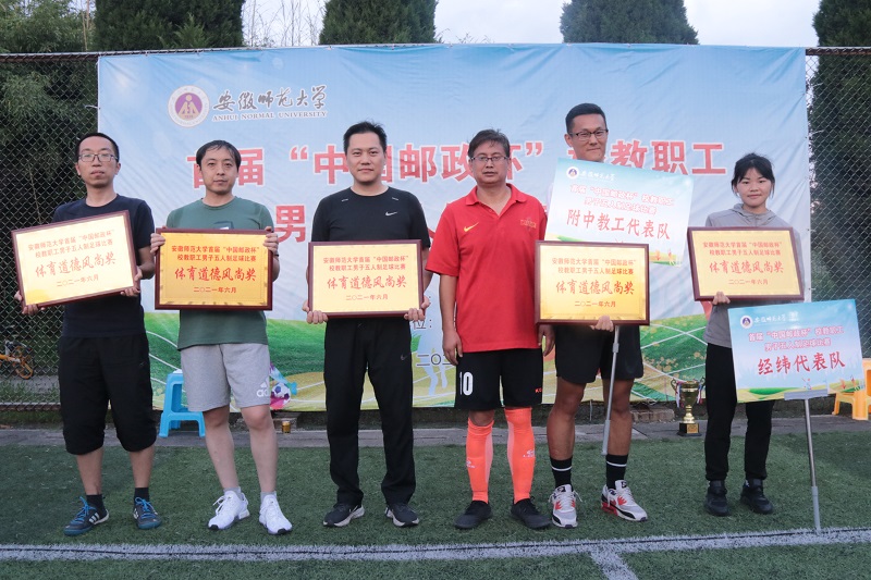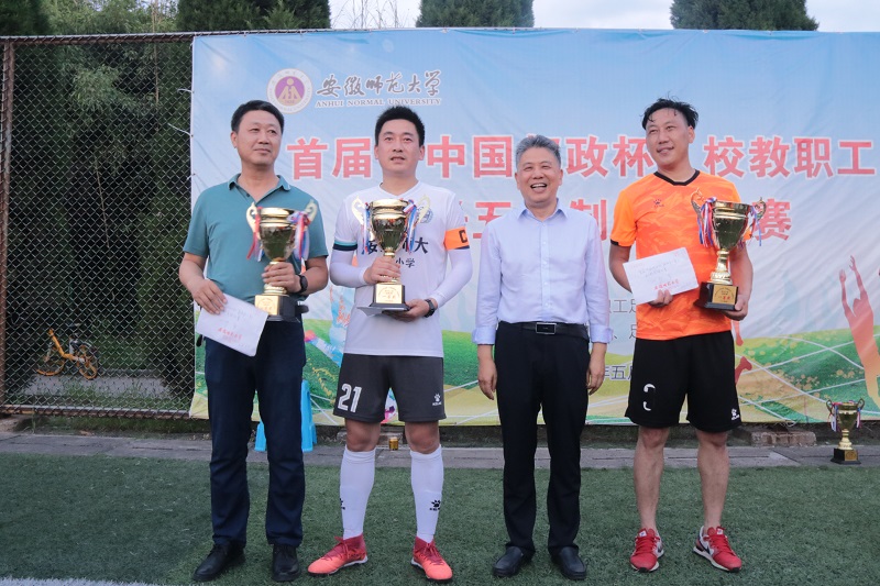 最终,金刚烷联队商永嘉,史数教工联队盖彦奇分别荣获教职工、研究生最佳射手称号。体院教工队、金刚烷联队(化材学院、皖江学院)、附小教工队获得一等奖,大象快跑队(新传学院、音乐学院、美术学院、外国语学院)、史数教工联队(历史学院、数统学院、文学院)、扬子鳄队(生科院)获得二等奖,物电教工队、机关队、先行者队(总务处)获得三等奖,经纬足球队(地旅学院)、计信学院教工队、附中教工队、一马当先队(马克思主义学院)、出版社队获道德风尚奖。同时比赛还评出了入选最佳阵容的教职工17人。与会领导为获奖球队和个人颁奖。