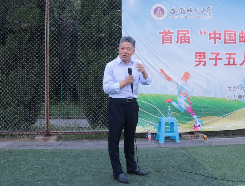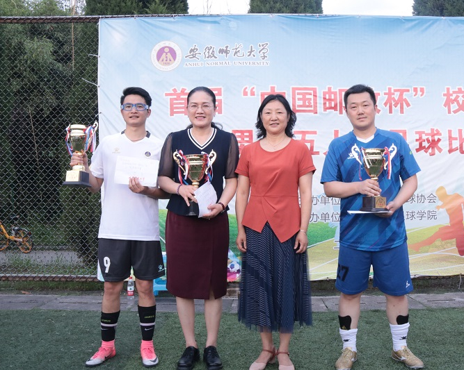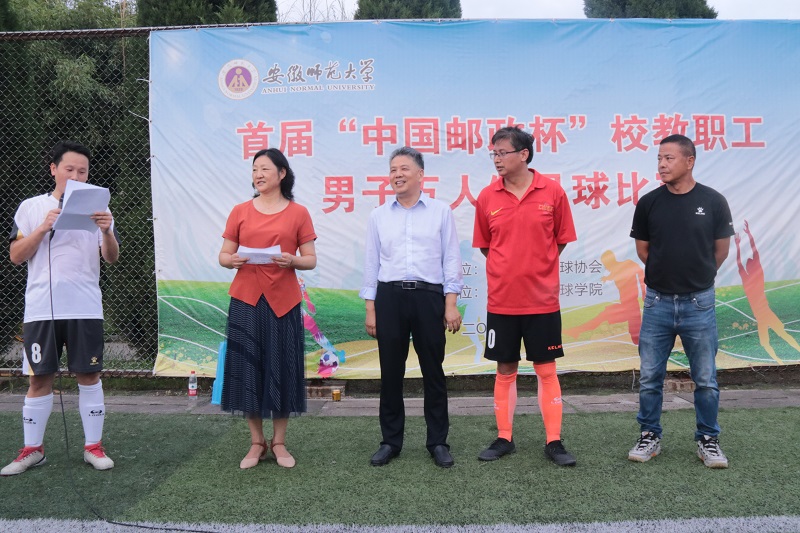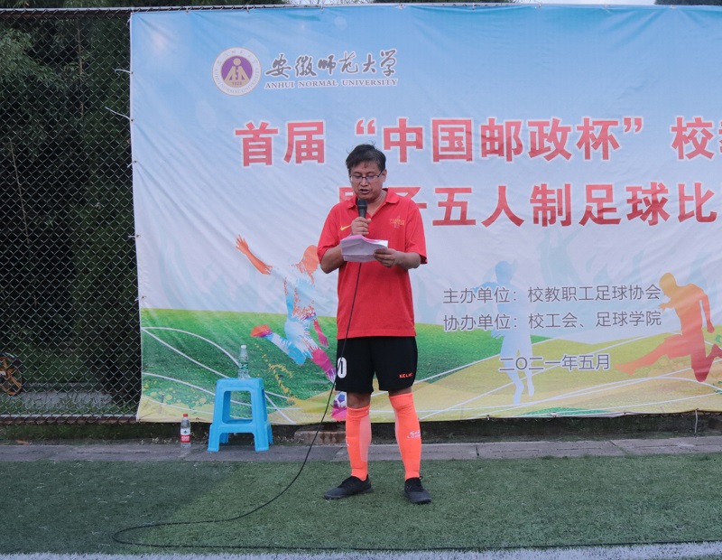 本网讯(校教工足球协会)6月9日下午,2021年安徽师范大学首届教职工五人制足球比赛决赛在花津校区南侧足球场进行,赛后举行了闭幕式。校党委常委、副校长陆林,校工会主席余大芹,校教工足协主席、教育部功能分子重点实验室主任商永嘉,校教工足协副主席、比赛监督尹文,以及各参赛队领队、教练员、运动员、裁判员出席了闭幕式。闭幕式由校教工足协秘书长、数统学院党委副书记芮先红主持。