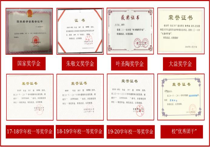 徐梦颖连续四年获校一等奖学金,获国家奖学金、朱敬文奖学金、大益奖学金、叶圣陶奖学金等,获校“三好学生标兵”、“优秀共青团干”、“优秀本科生导生”院“双十佳”等荣誉30余项;她积累实践经验,提升综合能力,获第十五届中国国际合唱节暨国际合唱联盟合唱教育大会一等奖、安徽师范大学师范生技能大赛音乐组一等奖等各类奖项30余项。现已成功推免苏州大学。