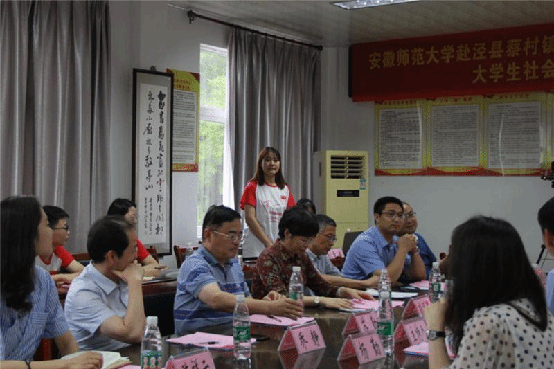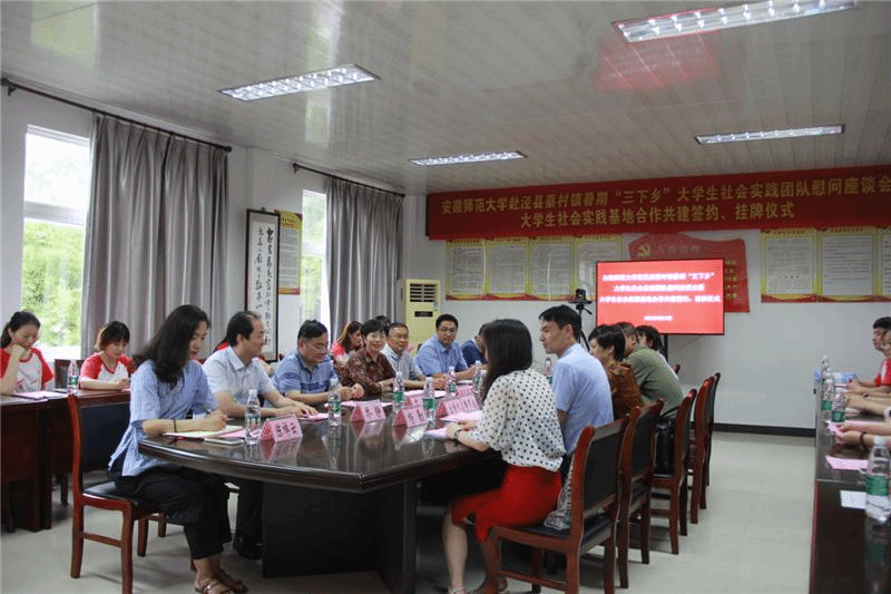 本网讯(地旅学院 韦银艳、陈祥云)7月17日下午,副校长彭凤莲,校团委副书记廖仲明、地旅学院党委书记贾冠忠、院长苏勤、党委副书记乔静一行来到泾县蔡村镇,亲切慰问地旅学院赴皖南川藏线农户生计调研实践团队的全体队员,泾县人民政府副县长张素兰、费罗成,蔡村镇党委书记蒋光庭、党委组织委员汪奇,泾县团县委副书记杨勤等同志热情接待了彭凤莲一行,并举行安徽师范大学赴泾县蔡村镇暑期“三下乡”大学生社会实践团队座谈会暨大学生社会实践基地合作共建挂牌仪式。活动由泾县副县长、我校地旅学院挂职干部费罗成主持。