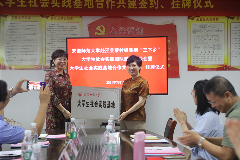 随后,乔静与汪奇签署了《大学生社会实践基地合作共建协议书》,彭凤莲与张素兰共同为实践基地揭牌,标志着安徽师范大学泾县蔡村镇社会实践基地正式建立。