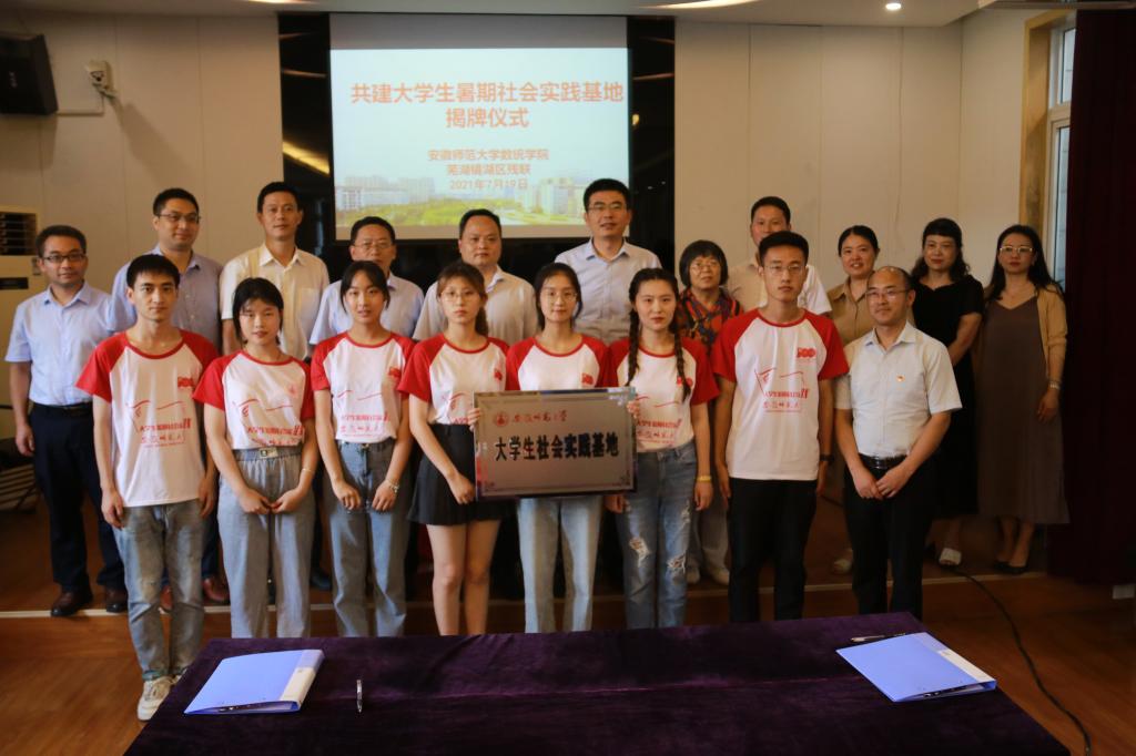 本网讯(数统学院 张德基、毕昌喜)7月19日,校党委常委、副校长任永,校团委副书记廖仲明,数统学院党委书记陈树贤、党委副书记芮先红、副院长汤敏、费明稳一行来到芜湖市镜湖区范罗山街道江南新村社区,慰问“一缕阳光”赴赴芜湖“蜜糖π递”关爱唐氏综合征儿童志愿服务社会实践团队全体队员,芜湖市镜湖区委副书记杨绍华,区委常委、宣传部部长王建明,区残联理事长笪秉春,区残联就业服务中心主任王君热情接待了任永一行,并举行安徽师范大学大学生暑期社会实践基地合作共建签约挂牌仪式暨大学生暑期“三下乡”社会实践团队座谈会。