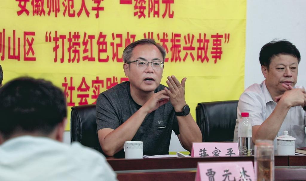 蒋家平一行首先来到金寨县古碑镇光爱学校,和实践团队师生一道,共同聆听了省立安徽大学在古碑镇黄家集办学的校史故事。讲述者黄本端是金寨县教育局退休教师,也是古碑镇黄家集人,生于1928年,与学校同岁,对学校在黄家集的办学历史如数家珍。在老人家的讲述中,使大家对1940年至1945年期间学校这段校史有了更深的了解。光爱学校校长石青华介绍了该校办学情况,对我校一直以来的关心和支持尤其是体育美育浸润计划的实施表达了感谢,并表示如今的光爱学校在安徽师大的旧址上办学,安徽师大的师生不遗余力地支持光爱学校的建设和发展是对师大精神在金寨新的继承和弘扬。