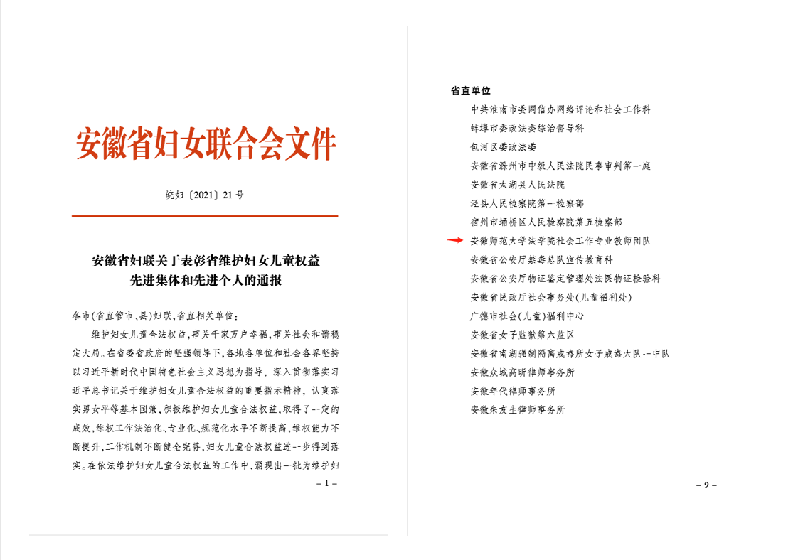我校法学院社会工作专业教师团队荣获“安徽省维护妇女儿童权益先进集体”称号