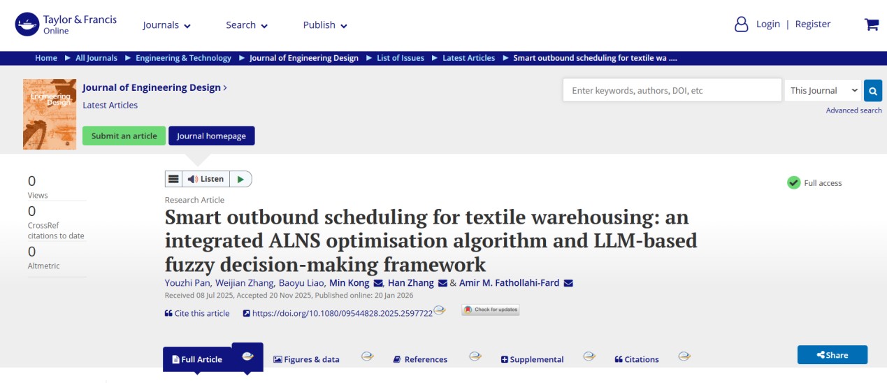 《Journal of Engineering Design》是Taylor & Francis旗下工程设计领域的国际知名期刊,JCR分区为Q1,以严谨的审稿标准和极低的录用率著称。论文以纺织行业仓储出库调度为研究对象,提出集成自适应大邻域搜索的多阶段出库调度优化模型,创新性引入基于大语言模型(LLM)的模糊决策支持框架,实现对非结构化业务需求与调度偏好的智能解析与辅助决策,展示了大模型技术在工程设计与智能调度领域的应用潜力。