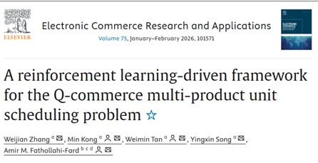 2024级工商管理学专业硕士研究生张维建以第一作者身份在计算机信息系统领域知名期刊《Electronic Commerce Research And Applications》发表题为“A Reinforcement Learning-Driven Framework for the Q-commerce Multi-Product Unit Scheduling Problem”的研究论文。该研究由数字经济系青年教师孔敏、谭卫民、宋颖欣共同指导完成。