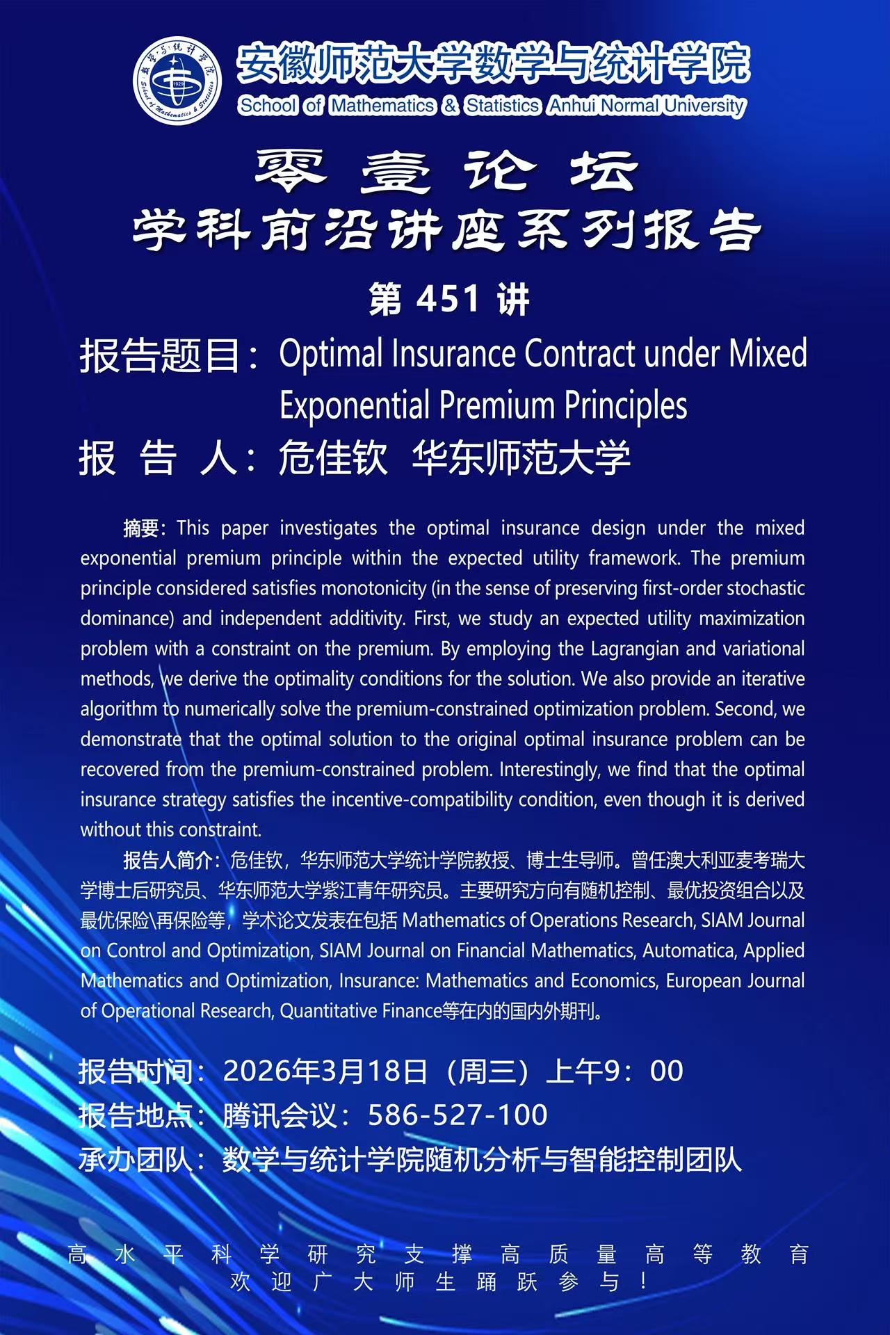 上一篇:【学术预告】数统学院零壹论坛第452讲:De Finetti's problem with fixed transaction costs and regime switching