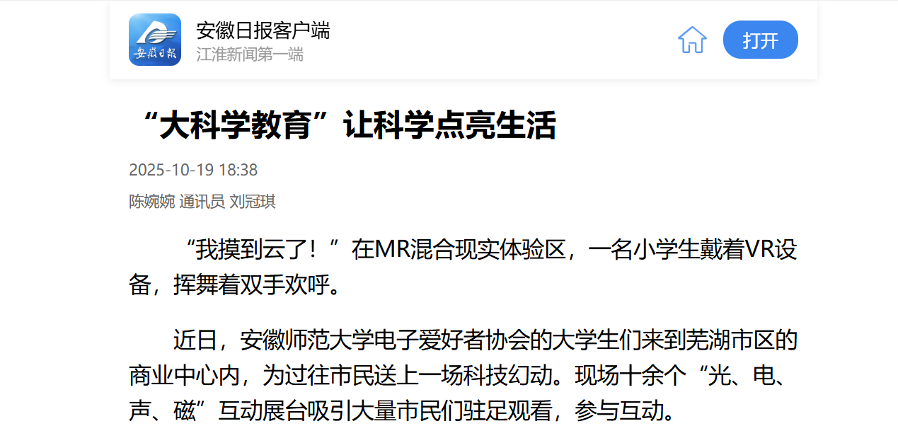 截至目前,安师大“大科学教育”已组建20余支科普志愿团队,招募志愿者500余人,走进社区20余个、中小学30余所,开展科普活动100余场,服务公众超2万人次,形成了高校、中学、社区多方联动的科普生态,让科学知识真正“飞入寻常百姓家”。