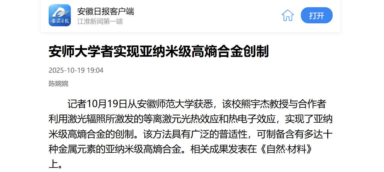 记者10月19日从安徽师范大学获悉,该校熊宇杰教授与合作者利用激光辐照所激发的等离激元光热效应和热电子效应,实现了亚纳米级高熵合金的创制。该方法具有广泛的普适性,可制备含有多达十种金属元素的亚纳米级高熵合金。相关成果发表在《自然·材料》上。