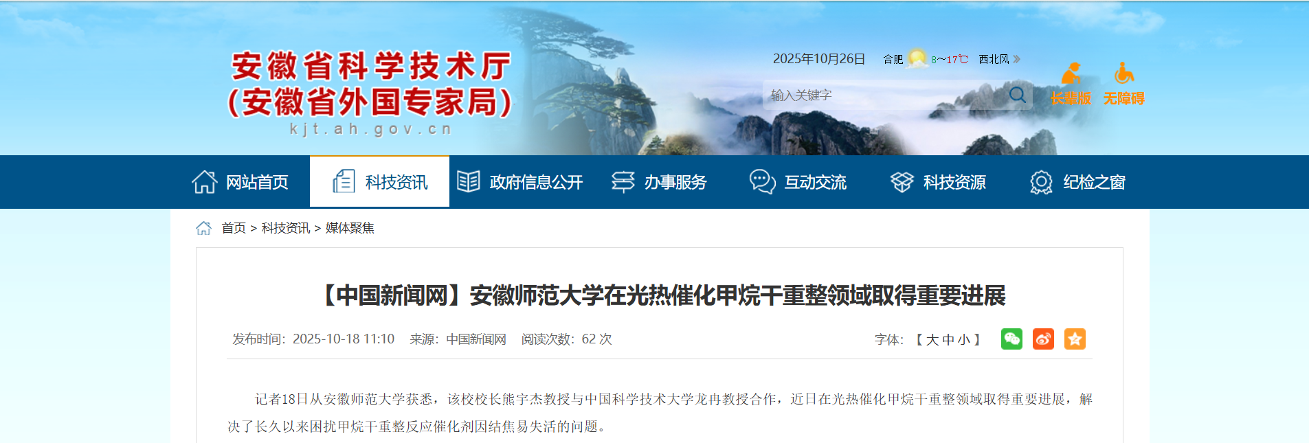 记者18日从安徽师范大学获悉,该校校长熊宇杰教授与中国科学技术大学龙冉教授合作,近日在光热催化甲烷干重整领域取得重要进展,解决了长久以来困扰甲烷干重整反应催化剂因结焦易失活的问题。