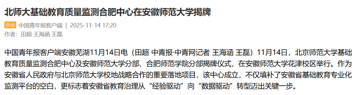 中国青年报客户端安徽芜湖11月14日电(田超 中青报·中青网记者 王海涵 王磊)11月14日,北京师范大学基础教育质量监测合肥中心及安徽师范大学分部、合肥师范学院分部揭牌仪式,在安徽师范大学花津校区举行。作为安徽省人民政府与北京师范大学校地战略合作的重要落地项目,该中心成立,不仅填补了安徽省基础教育专业化监测平台的空白,更标志着安徽省教育治理从“经验驱动”向“数据驱动”转型迈出关键一步。