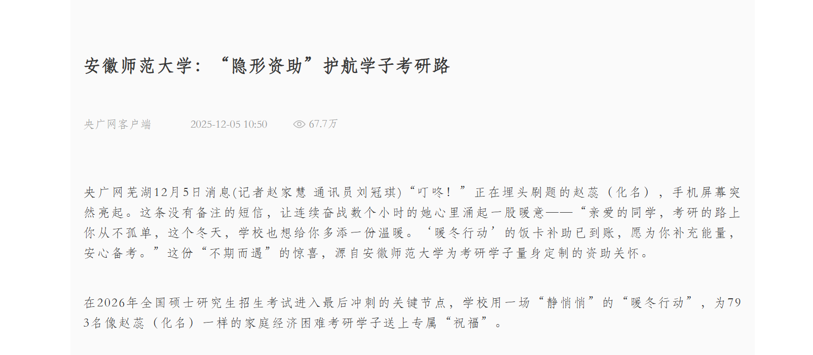 央广网芜湖12月5日消息(记者赵家慧 通讯员刘冠琪)“叮咚!”正在埋头刷题的赵蕊(化名),手机屏幕突然亮起。这条没有备注的短信,让连续奋战数个小时的她心里涌起一股暖意——“亲爱的同学,考研的路上你从不孤单,这个冬天,学校也想给你多添一份温暖。‘暖冬行动’的饭卡补助已到账,愿为你补充能量,安心备考。”这份“不期而遇”的惊喜,源自安徽师范大学为考研学子量身定制的资助关怀。