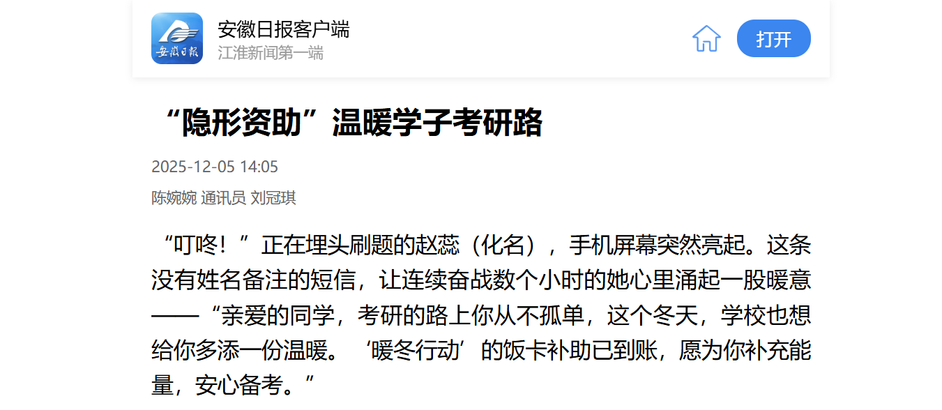 “叮咚!”正在埋头刷题的赵蕊(化名),手机屏幕突然亮起。这条没有姓名备注的短信,让连续奋战数个小时的她心里涌起一股暖意——“亲爱的同学,考研的路上你从不孤单,这个冬天,学校也想给你多添一份温暖。‘暖冬行动’的饭卡补助已到账,愿为你补充能量,安心备考。”
