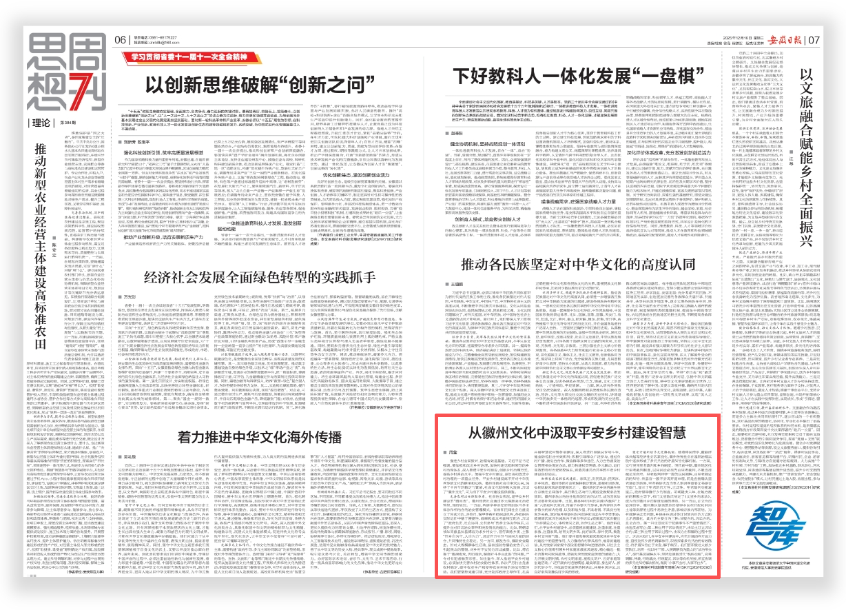 推进乡村全面振兴,治理有效是基础。习近平总书记强调,要加强和改进乡村治理,加快构建党组织领导的乡村治理体系,深入推进平安乡村建设,创新乡村治理方式,提高乡村善治水平。加强平安乡村建设,是加强和改进乡村治理的一项重点任务。平安乡村建设离不开对中华优秀传统文化的继承和弘扬。徽州传统社会自南宋以来,保持了千百年的稳定与繁荣,社会文化获得极大发展,形成了“徽州文化”,可为当下平安乡村建设提供借鉴。
