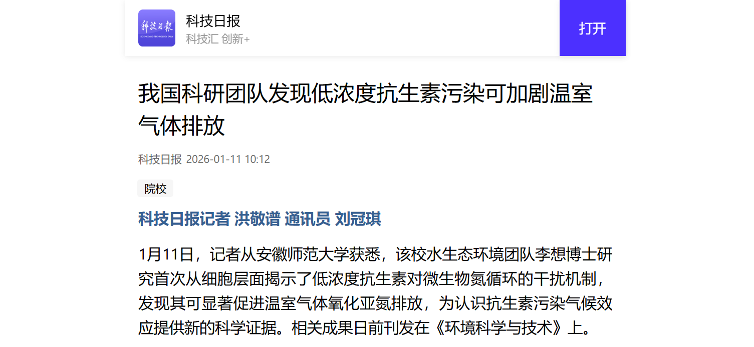【科技日报】我国科研团队发现低浓度抗生素污染可加剧温室气体排放