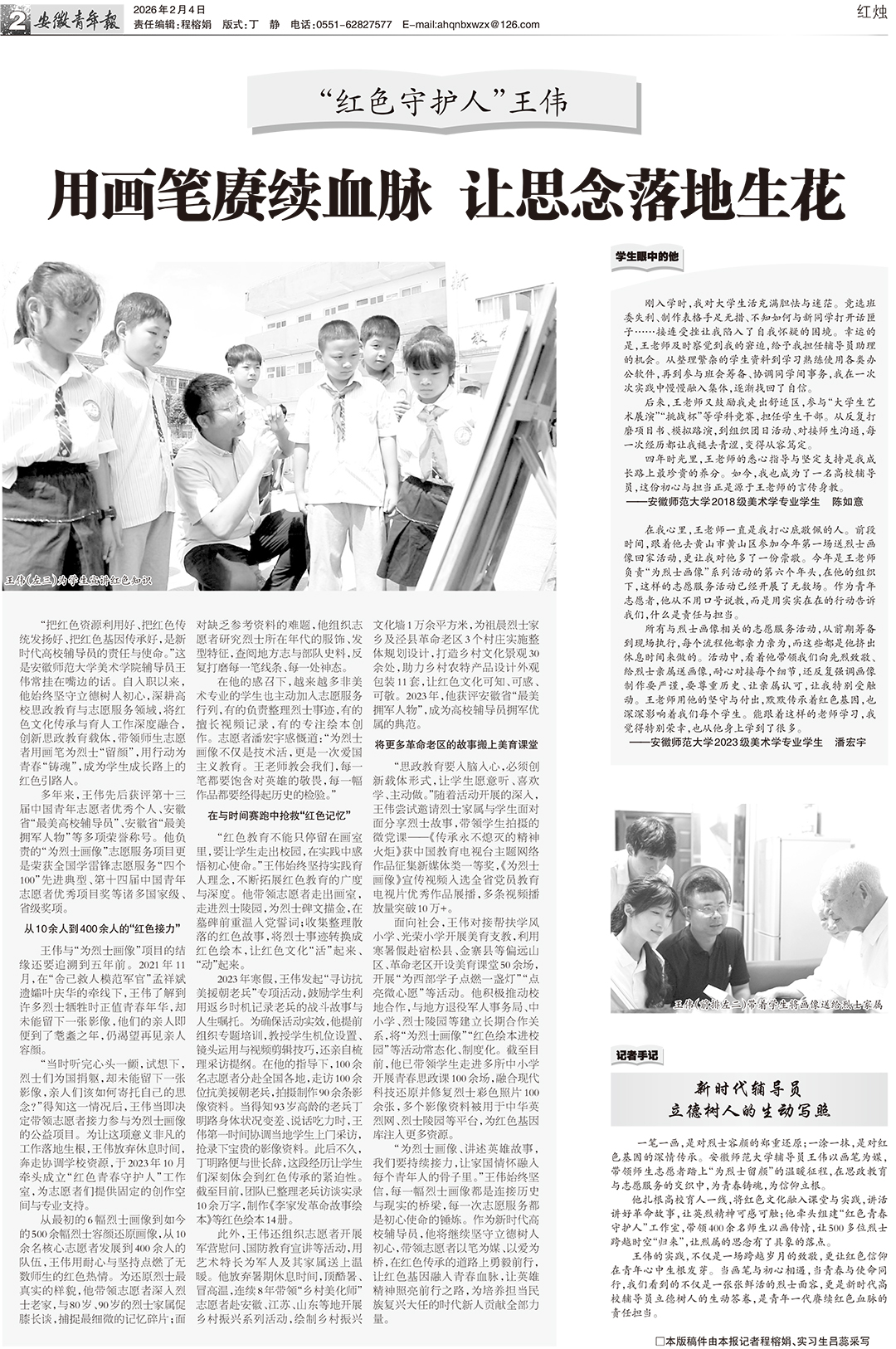 在我心里,王老师一直是我打心底敬佩的人。前段时间,跟着他去黄山市黄山区参加今年第一场送烈士画像回家活动,更让我对他多了一份崇敬。今年是王老师负责“为烈士画像”系列活动的第六个年头,在他的组织下,这样的志愿服务活动已经开展了无数场。作为青年志愿者,他从不用口号说教,而是用实实在在的行动告诉我们,什么是责任与担当。 所有与烈士画像相关的志愿服务活动,从前期筹备到现场执行,每个流程他都亲力亲为,而这些都是他挤出休息时间来做的。活动中,看着他带领我们向先烈致敬、给烈士亲属送画像,耐心对接每个细节,还反复强调画像制作要严谨,要尊重历史、让亲属认可,让我特别受触动。王老师用他的坚守与付出,默默传承着红色基因,也深深影响着我们每个学生。能跟着这样的老师学习,我觉得特别荣幸,也从他身上学到了很多。 ——安徽师范大学2023级美术学专业学生 潘宏宇