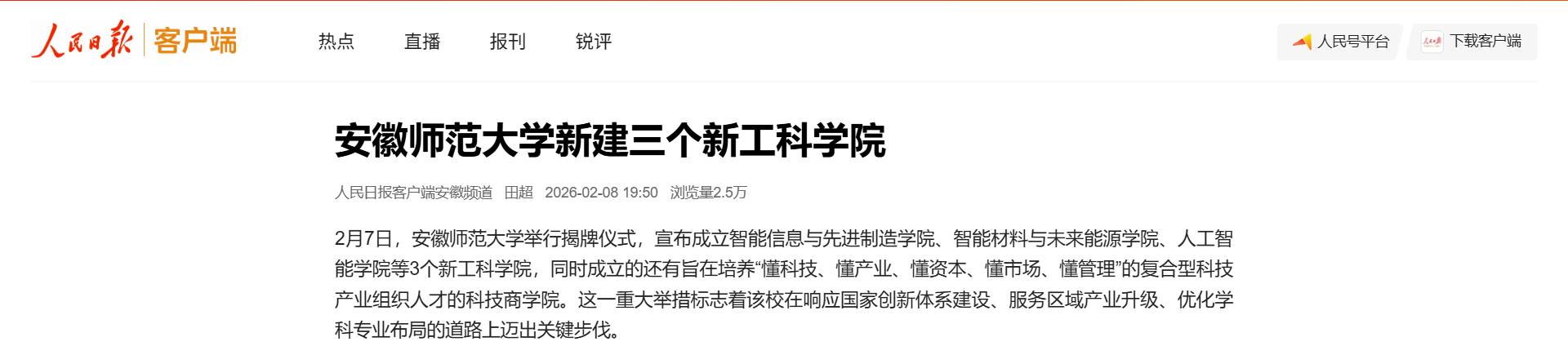 2月7日,安徽师范大学举行揭牌仪式,宣布成立智能信息与先进制造学院、智能材料与未来能源学院、人工智能学院等3个新工科学院,同时成立的还有旨在培养“懂科技、懂产业、懂资本、懂市场、懂管理”的复合型科技产业组织人才的科技商学院。这一重大举措标志着该校在响应国家创新体系建设、服务区域产业升级、优化学科专业布局的道路上迈出关键步伐。