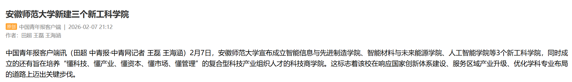 2月7日,安徽师范大学宣布成立智能信息与先进制造学院、智能材料与未来能源学院、人工智能学院等3个新工科学院,同时成立的还有旨在培养“懂科技、懂产业、懂资本、懂市场、懂管理”的复合型科技产业组织人才的科技商学院。这标志着该校在响应国家创新体系建设、服务区域产业升级、优化学科专业布局的道路上迈出关键步伐。