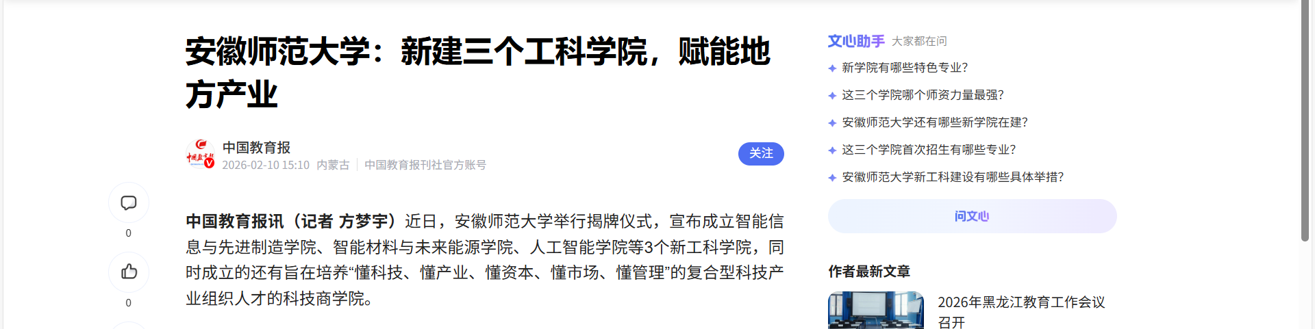 安徽师范大学党委书记蒋家平表示,新工科学院的成立,将为学校注入新的发展动能,促进该校从师范教育为主向“师范底蕴+工科硬核”双轮驱动的深度转型,也将有助于破解师范院校在服务国家战略、支撑地方发展与坚守师范主业之间可能出现的“两张皮”问题。