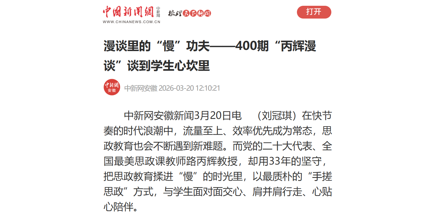 在快节奏的时代浪潮中,流量至上、效率优先成为常态,思政教育也会不断遇到新难题。而党的二十大代表、全国最美思政课教师路丙辉教授,却用33年的坚守,把思政教育揉进“慢”的时光里,以最质朴的“手搓思政”方式,与学生面对面交心、肩并肩行走、心贴心陪伴。
