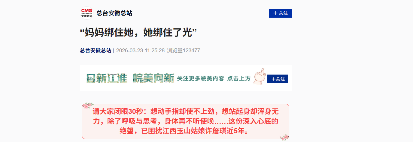 请大家闭眼30秒:想动手指却使不上劲,想站起身却浑身无力,除了呼吸与思考,身体再不听使唤……这份深入心底的绝望,已困扰江西玉山姑娘许詹琪近5年。
