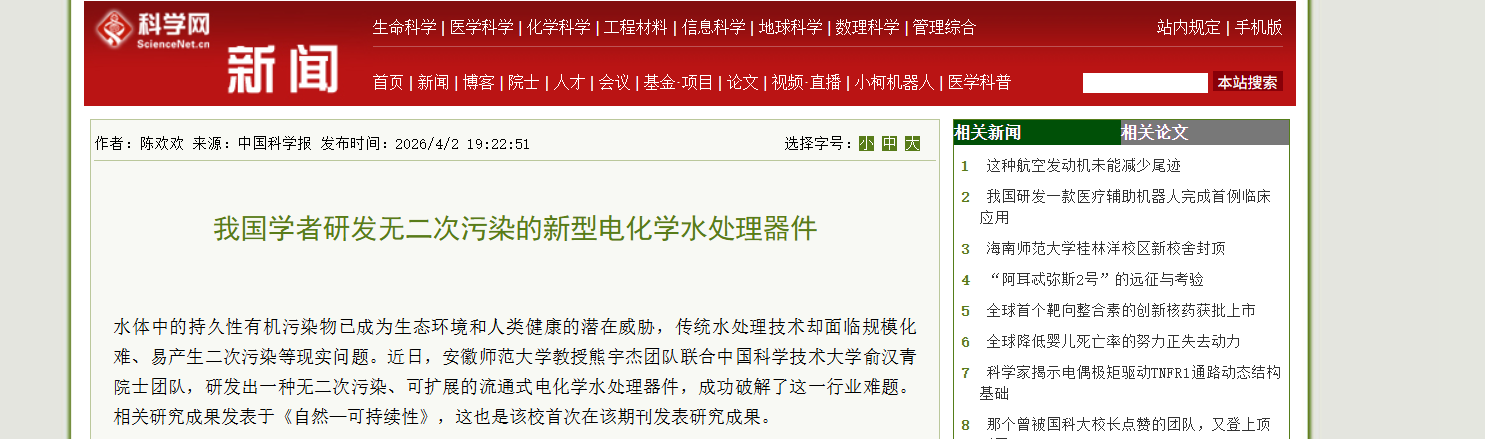 水体中的持久性有机污染物已成为生态环境和人类健康的潜在威胁,传统水处理技术却面临规模化难、易产生二次污染等现实问题。近日,安徽师范大学教授熊宇杰团队联合中国科学技术大学俞汉青院士团队,研发出一种无二次污染、可扩展的流通式电化学水处理器件,成功破解了这一行业难题。相关研究成果发表于《自然—可持续性》,这也是该校首次在该期刊发表研究成果。
