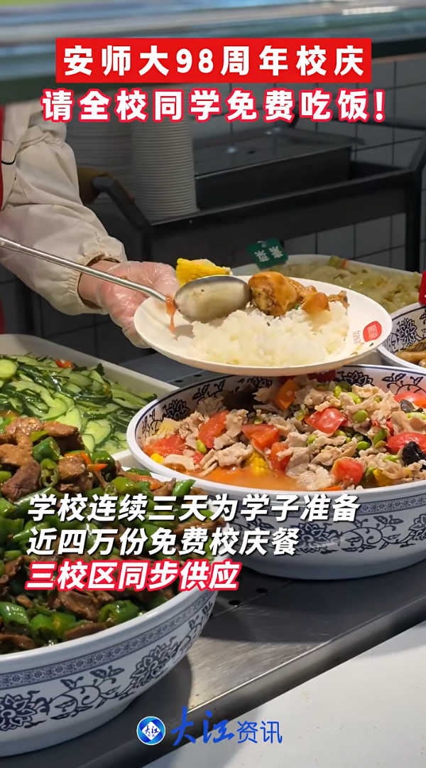 原报道阅读链接:【大江资讯】4月10日,安徽师范大学98周年校庆,学校连续三天为学子准备近四万份免费校庆餐,三校区同步供应。学校用烟火气守护青春,一餐一饭,皆是偏爱与期许。祝师大师生薪火相传,共赴芳华。