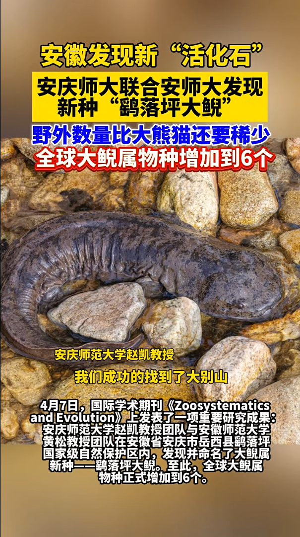 4月7日,国际学术期刊《ZoosystematicsandEvolution》上发表了一项重要研究成果:安庆师范大学赵凯教授团队与安徽师范大学黄松教授团队在安徽省安庆市岳西县鹞落坪国家级自然保护区内,发现并命名了大鲵属新种——鹞落坪大鲵。至此,全球大鲵属物种正式增加到6个。