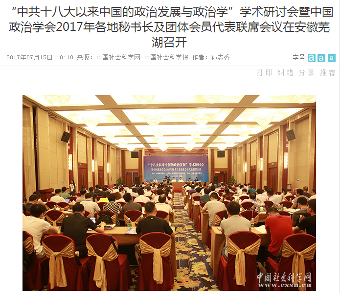 2017年7月15日,由中国政治学会主办,安徽师范大学承办,安徽省政治学会协办的“中共十八大以来中国的政治发展与政治学”学术研讨会暨中国政治学会2017年各地秘书长及团体会员代表联席会议在安徽芜湖召开。