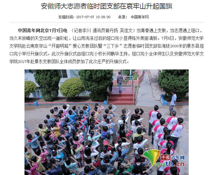 同聚垭口,五年皖滇情;开窗明路,共筑云南梦。十天,短的是时间,长的是情谊。彩云之南,相知同行;彩虹搭桥,心连彝汉。在垭口完小湛蓝的天空下,五星红旗迎风飘扬,志愿者们的志愿精神将永不停息。(李川 曾丹扬 吴佳文)