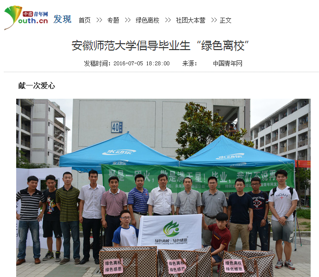 据悉,“绿色离校·绿色感恩”项目是由“绿色中国2011环保成就奖”最年轻获奖者陈文森2012年在西南石油大学毕业时发起,已成功举办四届。今年是“绿色离校·绿色感恩”项目开展的第五届,由共青团中央网络影视中心指导,未来网、物物福公益、一天公益联合主办,恒昌利通公司、中国青年网发现频道、生态中国网特别支持;今年自项目启动以来,已有200多所高校和高中的公益社团报名参与,活动遍及25省。(郭文静)
