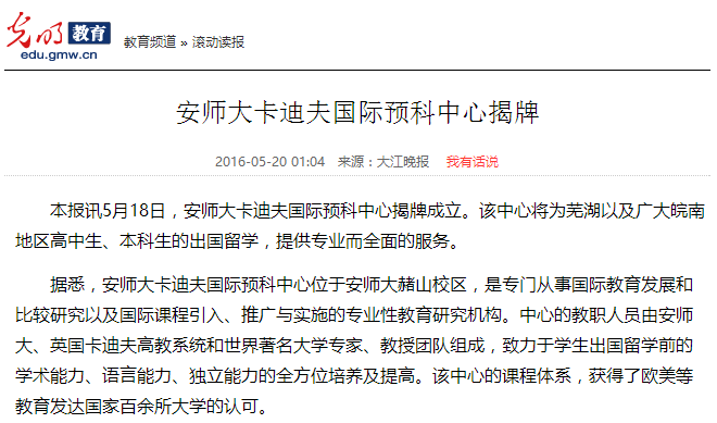 近日,安师大卡迪夫国际预科中心揭牌成立。该中心将为芜湖以及广大皖南地区高中生、本科生的出国留学,提供专业而全面的服务。