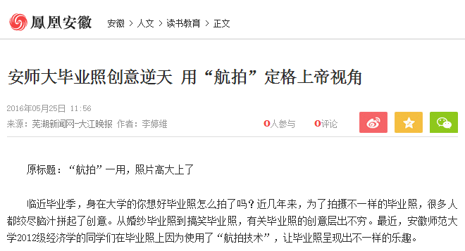 临近毕业季,身在大学的你想好毕业照怎么拍了吗?近几年来,为了拍摄不一样的毕业照,很多人都绞尽脑汁拼起了创意。从婚纱毕业照到搞笑毕业照,有关毕业照的创意层出不穷。最近,安徽师范大学2012级经济学的同学们在毕业照上因为使用了“航拍技术”,让毕业照呈现出不一样的乐趣。