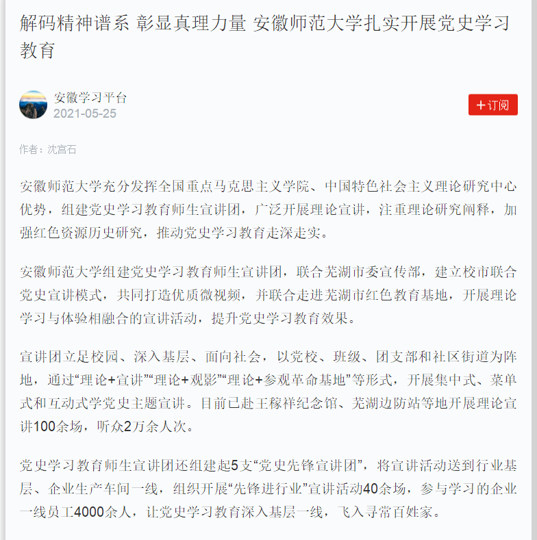 安徽师范大学加强安徽本土红色资源历史研究,该校学报微信公众号分期推送由本校教授撰写的《皖南事变前新四军的发展》《略论皖南事变前新四军的抗日游击战争》《皖南事变后新四军的党建工作》等“四史”研究文章,重温党的光辉历史,牢记党和军队的丰功伟绩,感悟真理的力量,坚定理想信念,永葆奋斗精神。