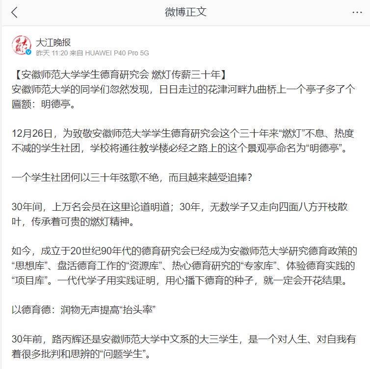 12月26日,为致敬安徽师范大学学生德育研究会这个三十年来“燃灯”不息、热度不减的学生社团,学校将通往教学楼必经之路上的这个景观亭命名为“明德亭”。
