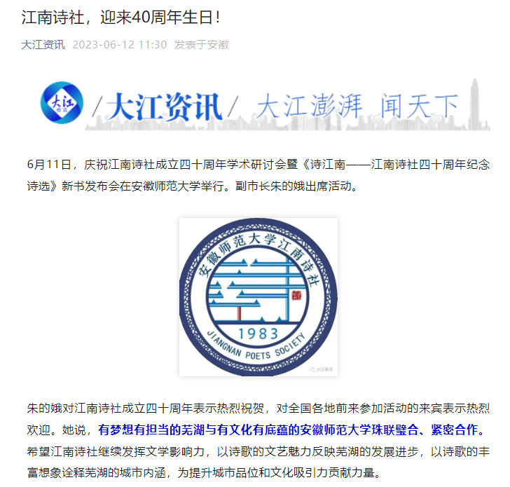 6月11日,庆祝江南诗社成立四十周年学术研讨会暨《诗江南——江南诗社四十周年纪念诗选》新书发布会在安徽师范大学举行。副市长朱的娥出席活动。