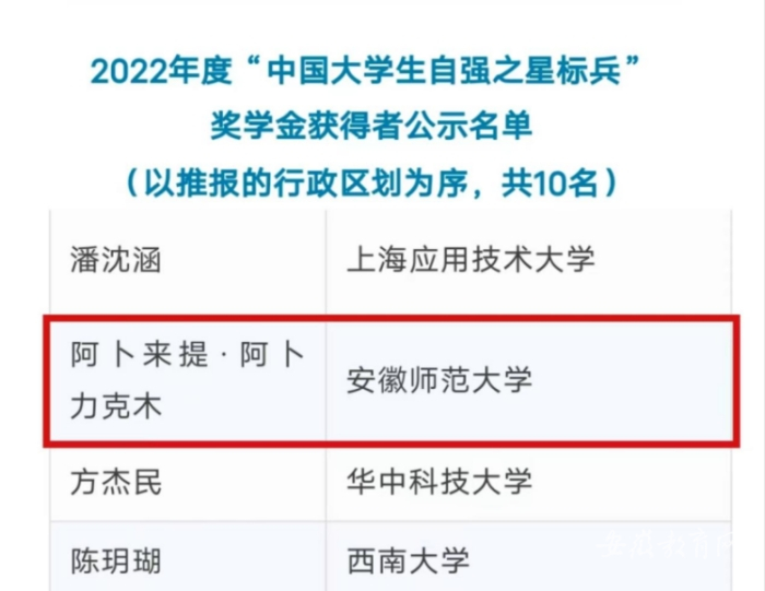 近日,由共青团中央、全国学联指导,中国青年报社、新东方教育科技集团、中国青年创业就业基金会联合举办的2022年度“中国大学生自强之星”奖学金推报活动名单公布,安徽师范大学地理与旅游学院2020级地理科学(师范)专业阿卜来提·阿卜力克木获评“中国大学生自强之星标兵”奖学金,全国仅10名优秀学子获此荣誉。安徽师范大学新闻与传播学院2020级网络与新媒体专业郭昊荣获2022年度“中国大学生自强之星”奖学金。