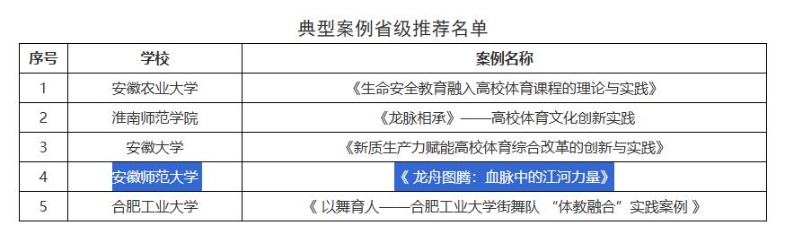 近日,安徽省教育厅发布了《关于教育部高校体育风采视频和典型案例省级遴选推荐结果的公示》,我校参评的“龙舟图腾:血脉中的江河力量”案例成功获评推荐。