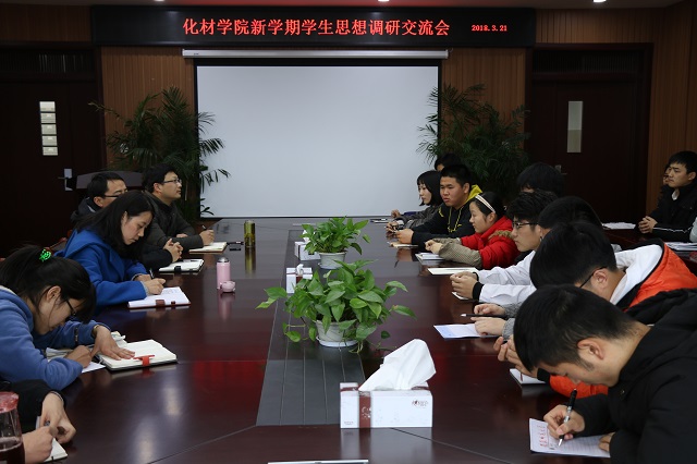 本网讯(化材学院 王若馨 王国良)为了更好地了解学生思想动态,解决学生思想困扰,化材学院于3月21日下午四点半在理科大楼702室召开了新学期学生思想调研交流会。院党委书记汪俊武、党委副书记余妍霞、副院长张小俊及20余名学生代表参加了此次会议。