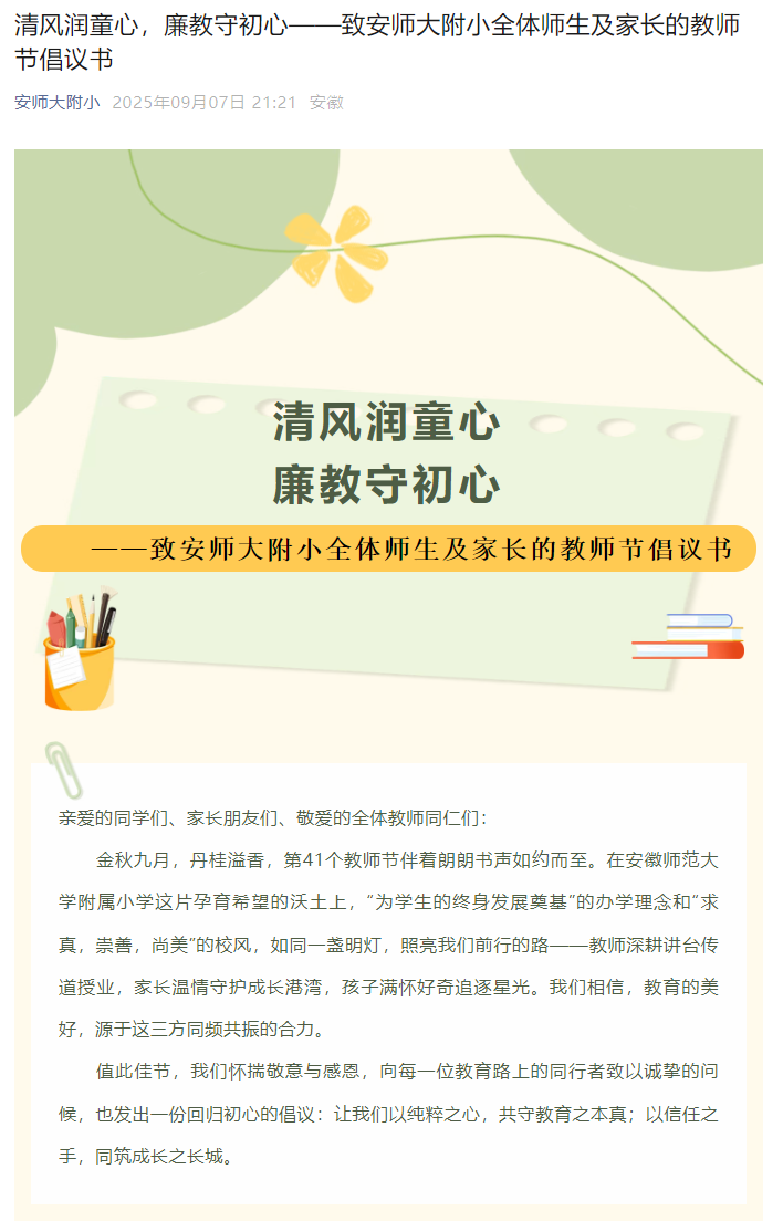 时维九月,秋澄景明。在第41个教师节到来之际,安徽师范大学附属小学以“清风润童心,廉教守初心”为主题,开展发布倡议书、赠送绿植、召开新老教师座谈会等系列活动,以务实之举彰显教育温度,用精神传承筑牢育人根基。