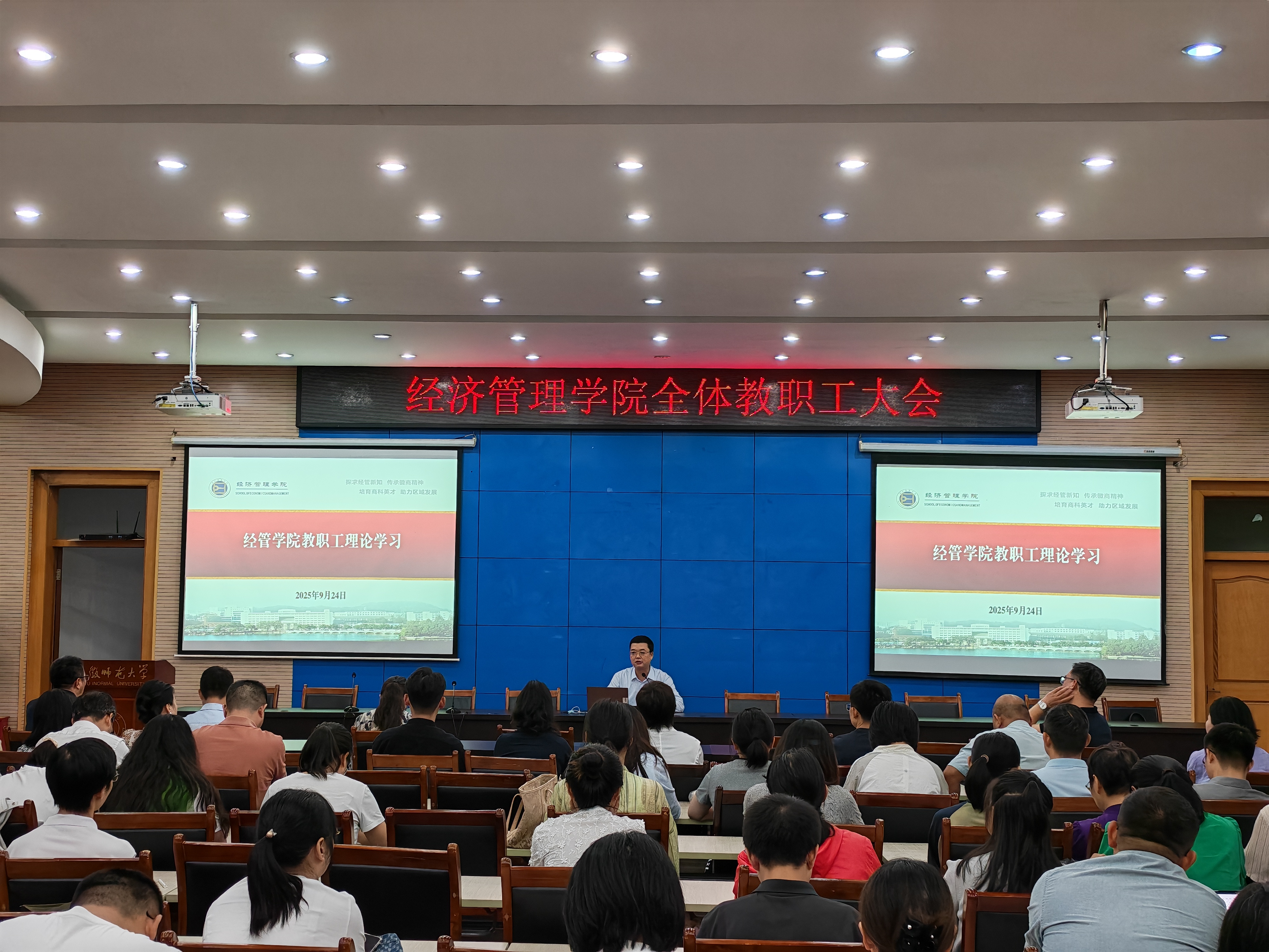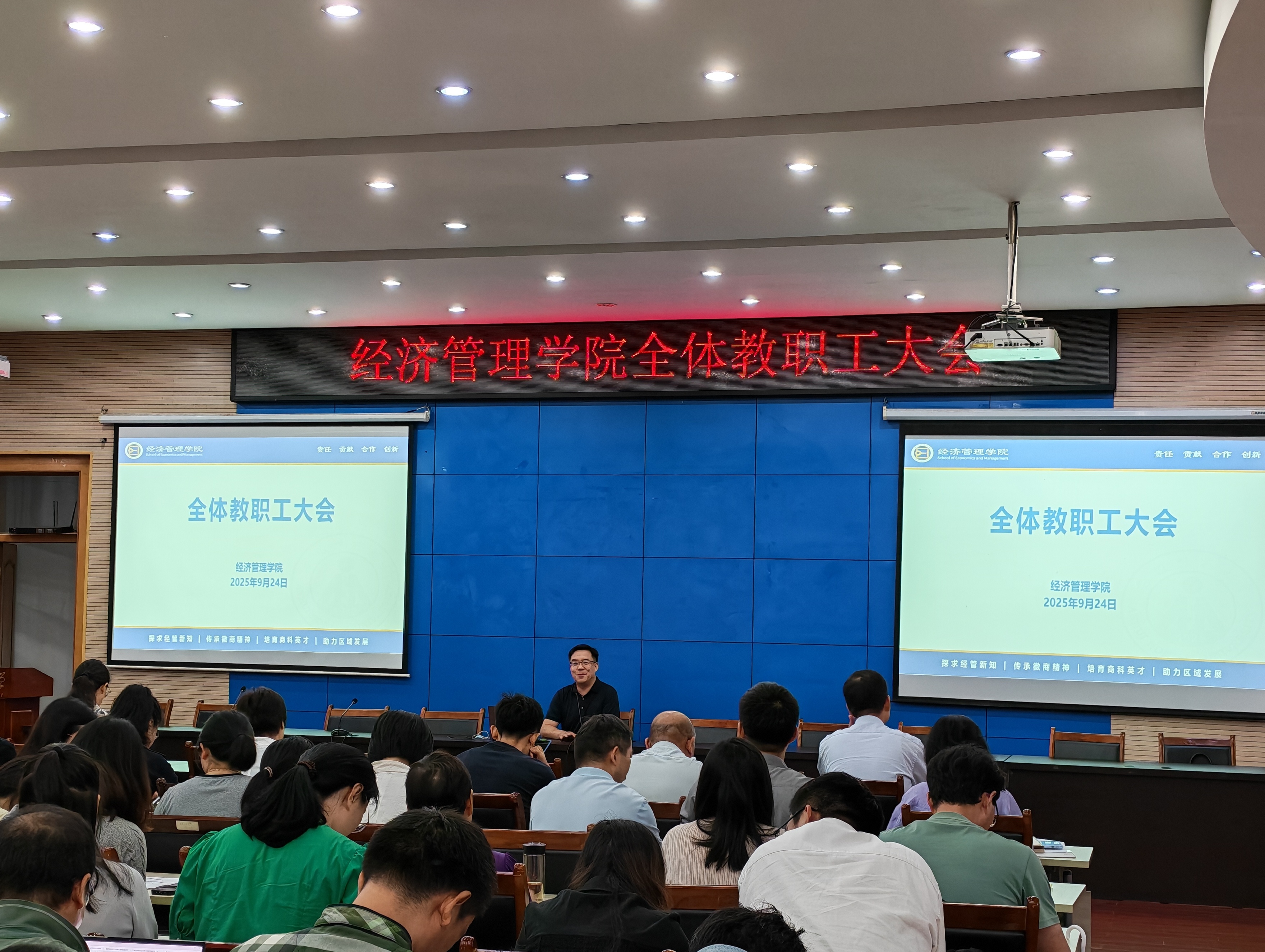 9月24日下午,经济管理学院在会议中心第三报告厅召开教职工政治理论学习会暨全体教职工大会,学院全体教职工参加会议,院党委副书记、院长张廷龙主持会议。