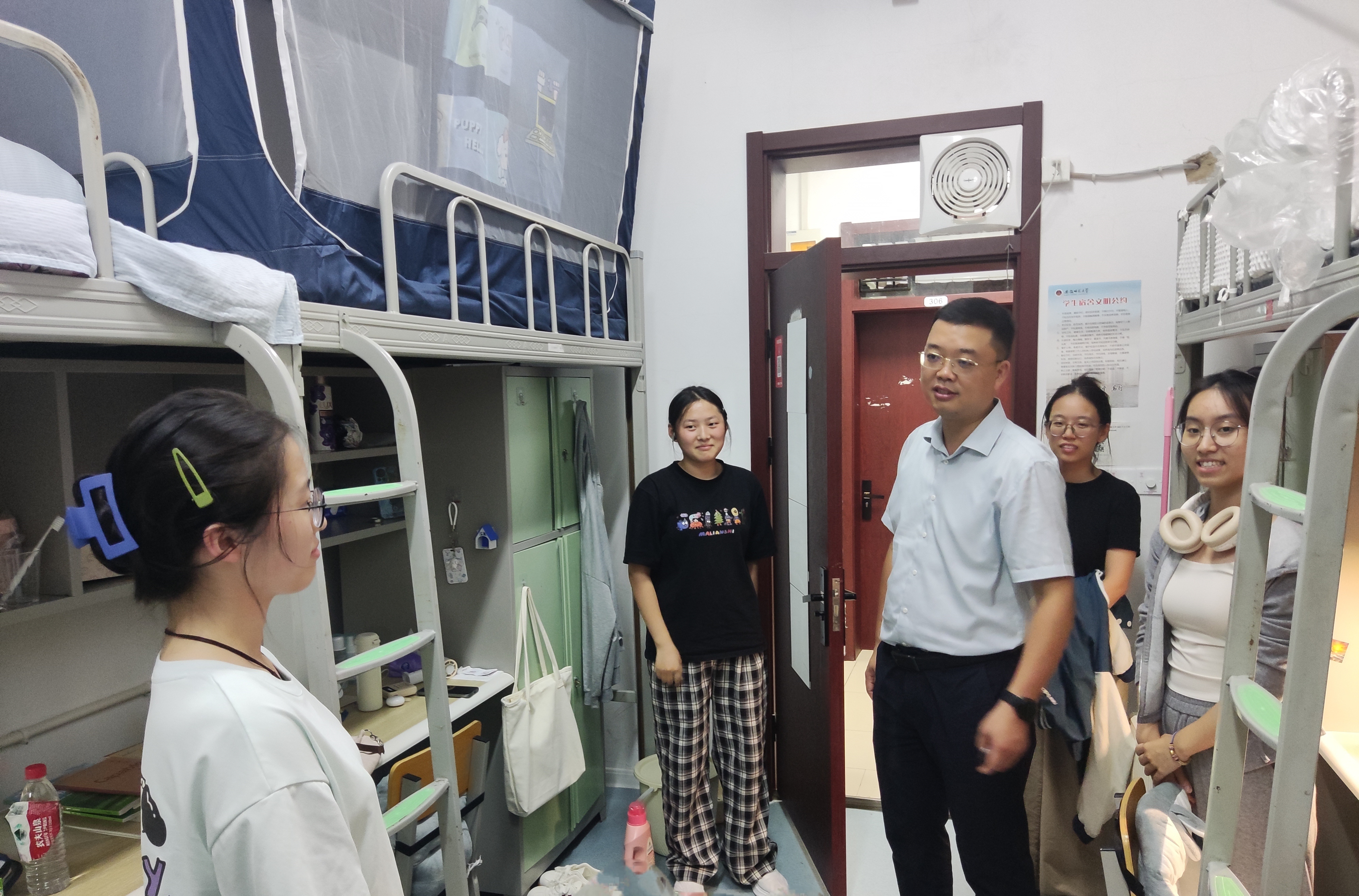院党委副书记(主持党委工作)孙良林在走访新生宿舍时,与新生们进行了亲切交流,详细关心询问他们入学后的状态感受,了解同学们的需求和困难。他希望同学们尽快适应大学生活和学习变化,鼓励大家科学规划大学生涯、认真学习知识技能、不断提升文明修养。学院将积极帮助大家解决学习、生活上的实际困难,护航同学们成长成才。副院长徐飞在走访中提醒学生要严格遵守校规校纪,做好宿舍个人卫生,晚点名相关工作,勉励学生要珍惜与室友、同学相处的大学时光,要以良好的状态,全身心投入到大学的学习和生活中去,不断提升自己的专业素养与综合能力。